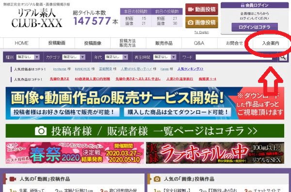 Club-XXXの入会は、トップページ右上の「入会案内」より行います。